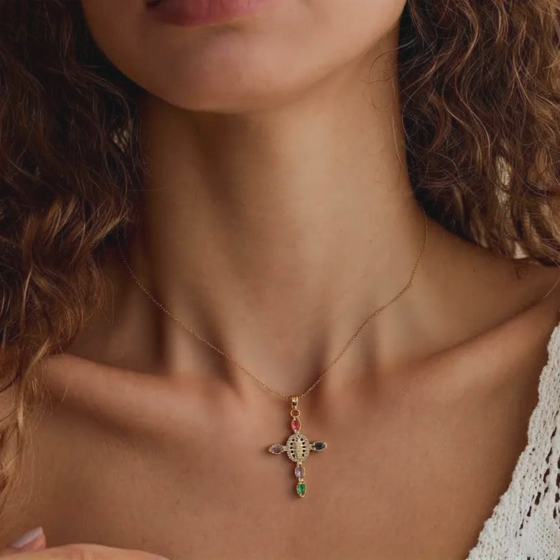 Deze verfijnde gouden ketting is afgewerkt met een sierlijk kruis-hanger, rijk gedetailleerd met meerkleurige edelsteenaccenten. De combinatie van warme goudtinten en levendige stenen geeft het ontwerp een elegante, luxueuze uitstraling. Een tijdloos statement piece dat moeiteloos elke look verheft.