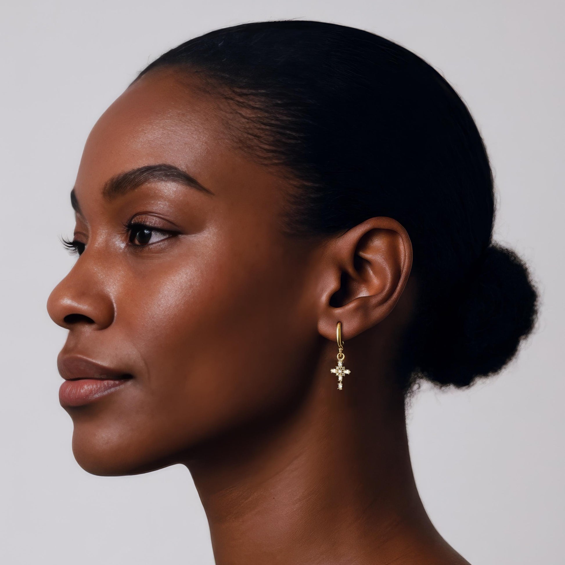 Deze elegante goudkleurige oorbellen met kruis-hangers zijn rijkelijk versierd mer fonkelende, marquise-geslepen zirkonen. Een schitterende eyecather voor elke gelegenheid.