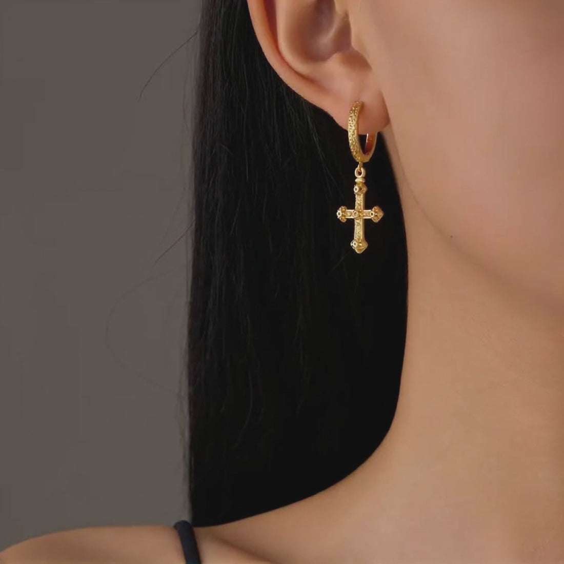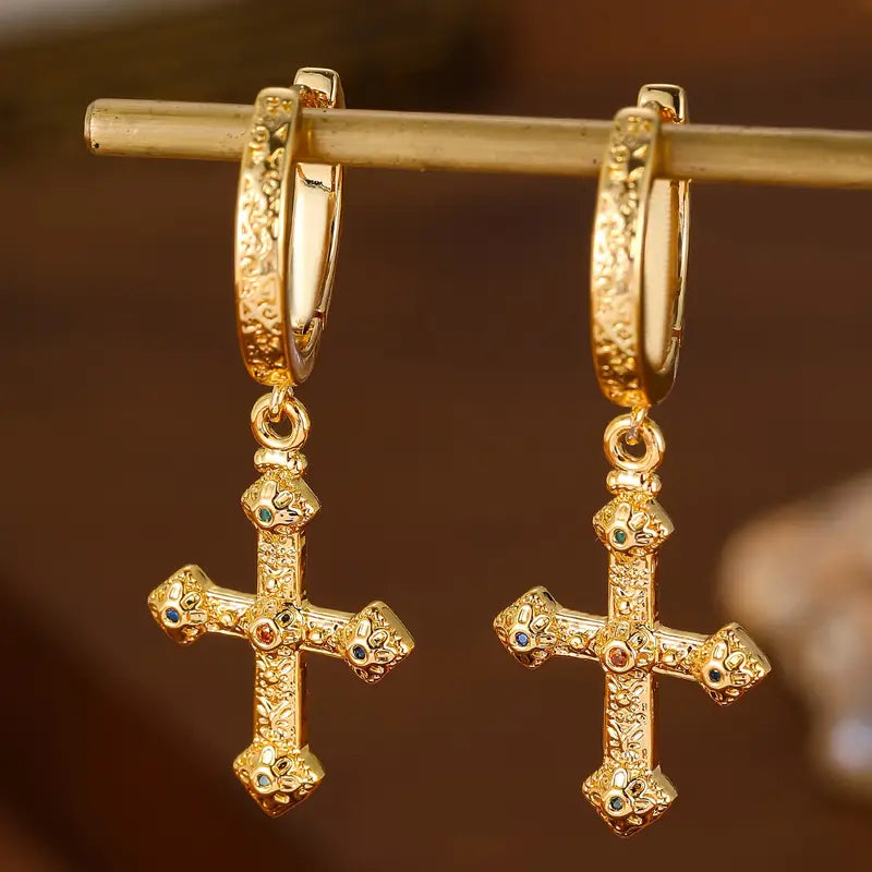 Deze verfijnde goudkleurige oorbellen combineren klassiek design met ambachtelijke details. De rijk bewerkte oorringen lopen over in een prachtig gedecoreerd kruis-hangertje, afgewerkt met subtiele reliëf details en kleine accentsteentjes voor een luxueuze uitstraling.
