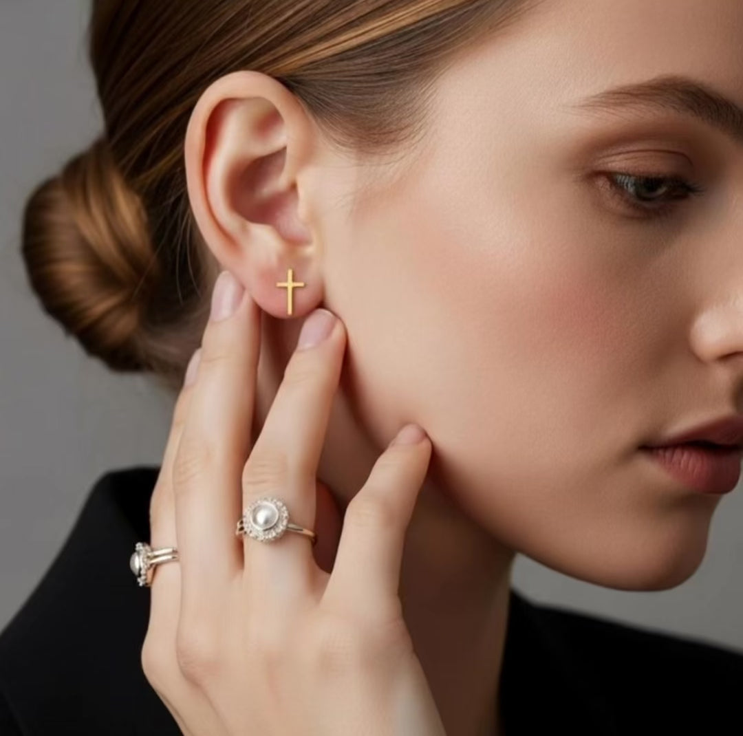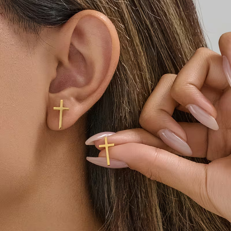 Stijlvolle goudkleurige kruis oorstekers met een minimalistisch design. De gladde, strakke afwerking geeft ze een moderne look, perfect voor dagelijks gebruik.