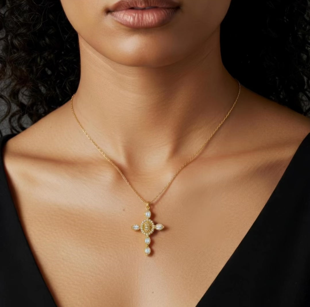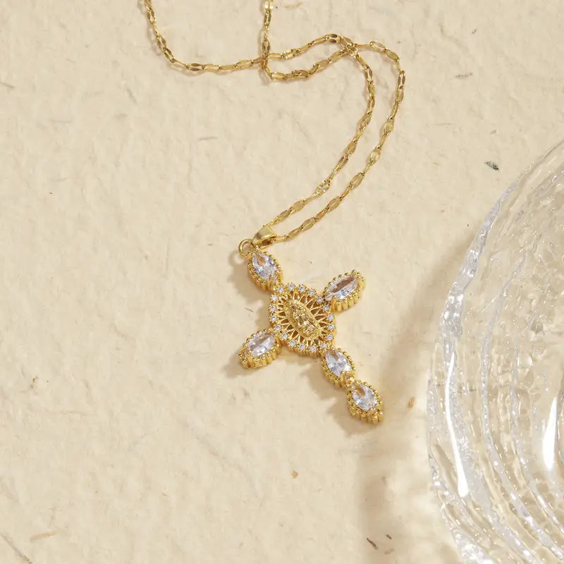 Deze elegante gouden ketting heeft een verfijnde kruis-hanger met fonkelende, helder geslepen stenen. De subtiele glans en fijne details geven het sieraad een luxe uitstraling die moeiteloos past bij zowel dagelijkse outfits als feestelijke gelegenheden.
